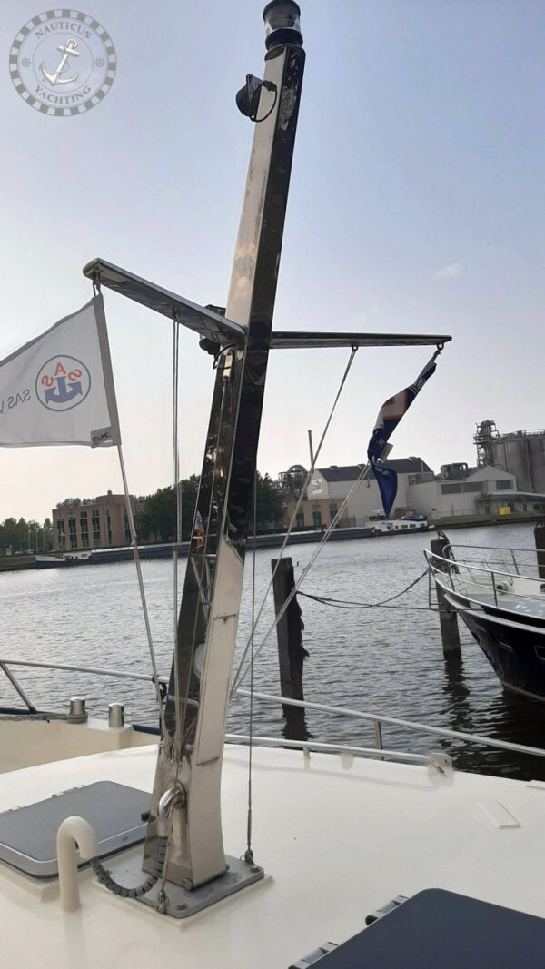 Een derde, op maat gemaakte elektrisch klapbare RVS mast ondersteunt ondermeer het toplicht als er niet gezeild wordt. Samen met de lage doorvaarthoogte van slechts 2,95m komt u met deze 1220 OK motorzeiler werkelijk bijna overal.