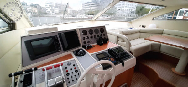 - Interior : Original Ferretti design, cherrywood paneling with leather levers, teak floorings in very good condition