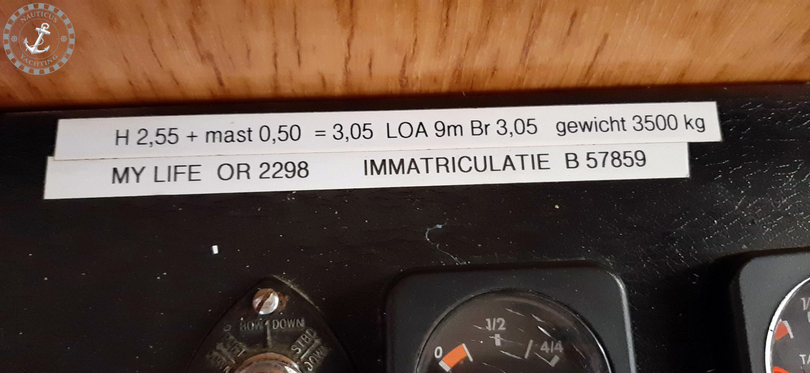 - LOA 9,00m (8,60m zonder zwemplatform), breed 3,15m, diepgang : 0,80m, minimale doorvaarhoogte 2,55m